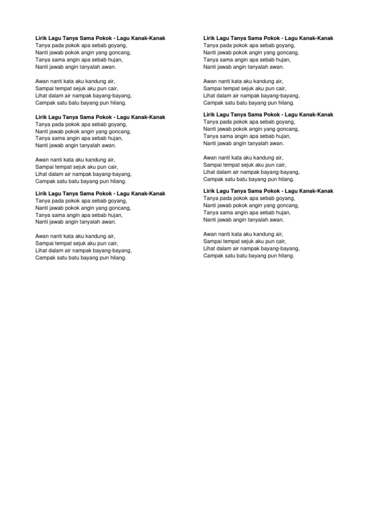 Lirik Lagu Tanya Sama Pokok Tanya Sama Pokok - Lagu Kanak-KanakTanya pada pokok apa sebab goyangNanti jawab pokok angin yang goncangTanya sama angin apa sebab hujanNanti jawab angin tanyalah awanAwan nanti kata aku kandung airSampai tempat sejuk aku pun cairLihat dalam air nampak bayang-bayangCampak satu batu bayang pun hilang. Green Small Fresh Summer. Awan nanti kata aku kandung air Sampai tempat sejuk aku pun cair Lihat dalam air nampak bayang-bayang Campak satu batu bayang pun hilang.